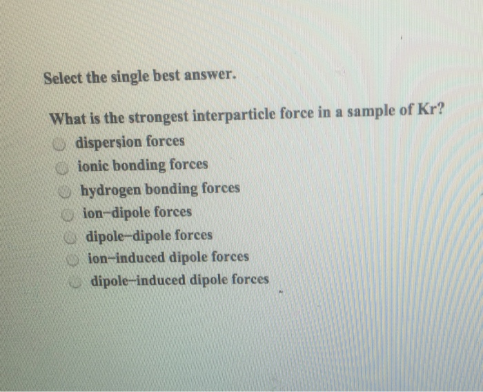 Since the electrons in an atom or molecule may be unevenly distributed at any one instant, dispersion forces are present in. What is the strongest interparticle force in a sample of kr andin a sample of sbh3? What is the strongest interparticle force in a sample of kr? Solution for what is the strongest interparticle force in each substance?(a) kr(b) brf(c) h₂so₄ 80% (15 ratings) 1) what is the strongest interparticle force in a sample of kr is london dispersion force. It is nobel gas. View the full answer. Select the single best answer. What is the strongest interparticle force in a sample of kr?
